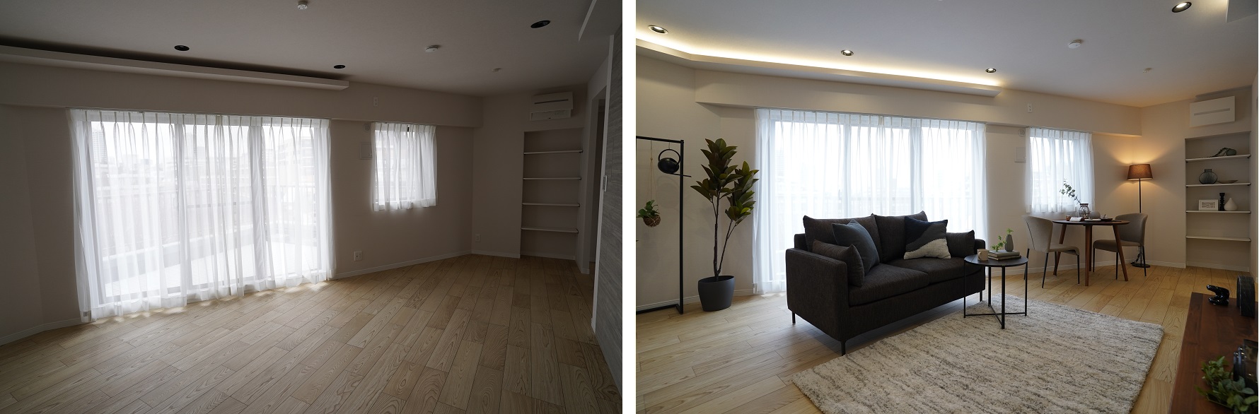ホームステージングの効果については、空室状態の物件画像とホームステージングが実施された物件画像を見比べてみると、部屋の印象が大きく異なるということがよくわかると思います。