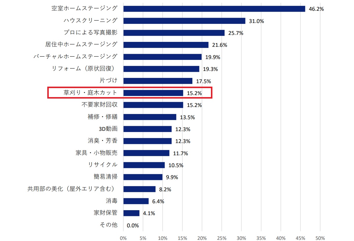 上のグラフは、一般社団法人日本ホームステージング協会が毎年実施しているホームステージングに関する実態調査のデータです。これによると、2024年度に実施されたホームステージングについて、「草刈り・庭木カット」が実施されているケースが約15%となっています。