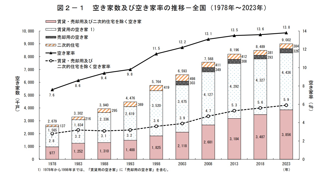 上のグラフは、1978年~2023年までの空き家率をグラフ化したものです。これからも分かるように、日本国内の空き家は急激な勢いで増加していることがよくわかります。