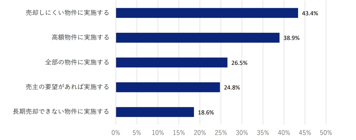 実際に、ホームステージングを実施するかどうかの判断については、以下のデータの通り、一般的に売却が難しいと考えられる物件や長期的に売れ残っている物件に実施され、価格を下げる前の最終手段として採用されています。