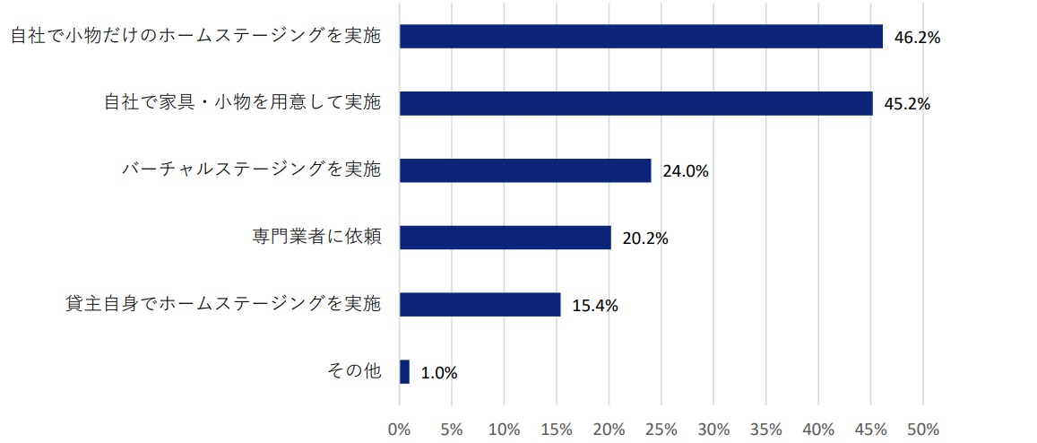 次は、ホームステージングの実施方法についてみていきます。不動産の売買においては、専門のホームステージング業者に依頼するという回答が4割近くと、最も多い割合を占めるようになっています。しかし、賃貸物件市場においては、以下の通り、仲介を担う不動産会社が行うというケースが多いようです。