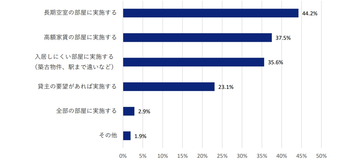 ホームステージングが必要かどうかについては、上のグラフが分かりやすいです。やはり長期間空室が続いているという理由が最も多くの割合を占めていて、空室対策を目的にホームステージングが実施されています。「入居しにくい部屋に実施する」については、そのままの状態で入居者募集を行ったとしても、空室期間が長引くと考え、事前の対策としてホームステージングが実施されていると予想できます。