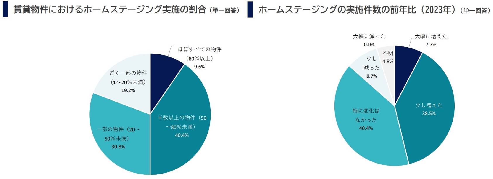 上の左側の画像は、ホームステージングを取り入れている企業が、自社が取り扱っている賃貸物件においてホームステージングを実施した物件の割合を示しています。2023年度の賃貸物件市場では、半数以上の物件にホームステージングを実施しているという企業が50%となっています。また「20~50%に実施」と回答している企業が約30%となっているため、かなりの割合の物件にホームステージングが実施されるようになっていると考えられるでしょう。