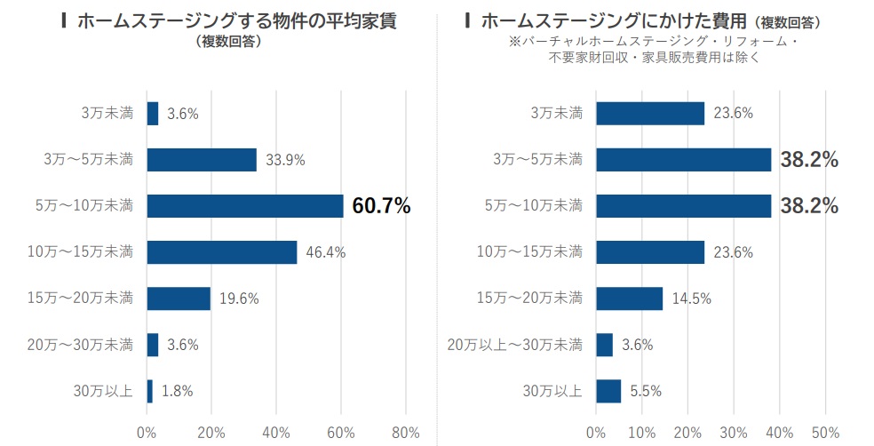 2022年度の賃貸物件市場におけるホームステージングでは、家賃が5万~10万未満の物件に対して実施されているケースが6割以上となっています。一方、ホームステージングにかけられた費用については、3万~5万未満が38.2%、5万~10万未満も38.2%という割合になっています。つまり、2022年度のホームステージングについては、0.5~1カ月分の家賃をベースにホームステージングが施されていたと分析することができます。