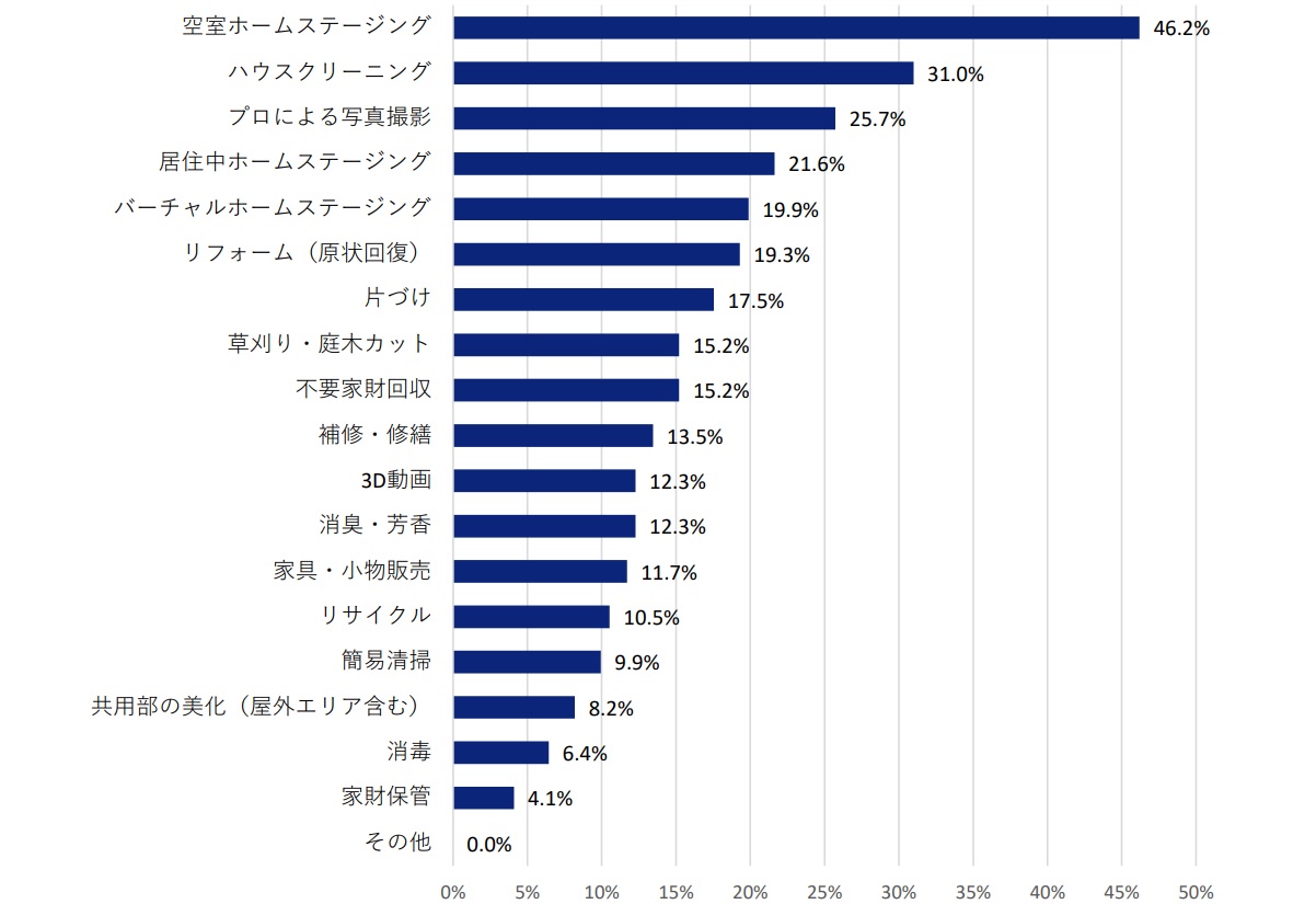 ただ、「ホームステージング=家具などを配置する方法」という理解は間違っています。ホームステージングの目的は、不動産の売買や賃貸において「高値での売却」や「早期の成約」であり、これを実現するために実施する対策全般がホームステージングの一種と言えるのです。実際に、日本ホームステージング協会が公表しているホームステージング白書2024年では、2023年度の不動産売買、賃貸部門で実施されたホームステージングの内容について、以下のようなデータを公表しています。