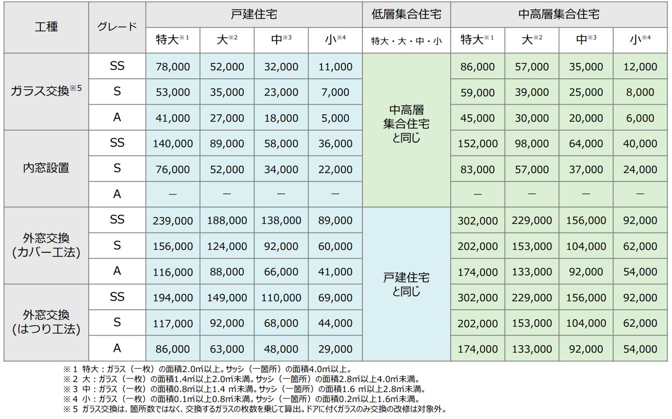 各工事の補助金額については、対象となる窓の大きさや工事後に実現する断熱性能などによって変わります。窓の断熱改修を実施する際、以下の単価表と照らし合わせ、合計の補助金額が計算できるようになっています。