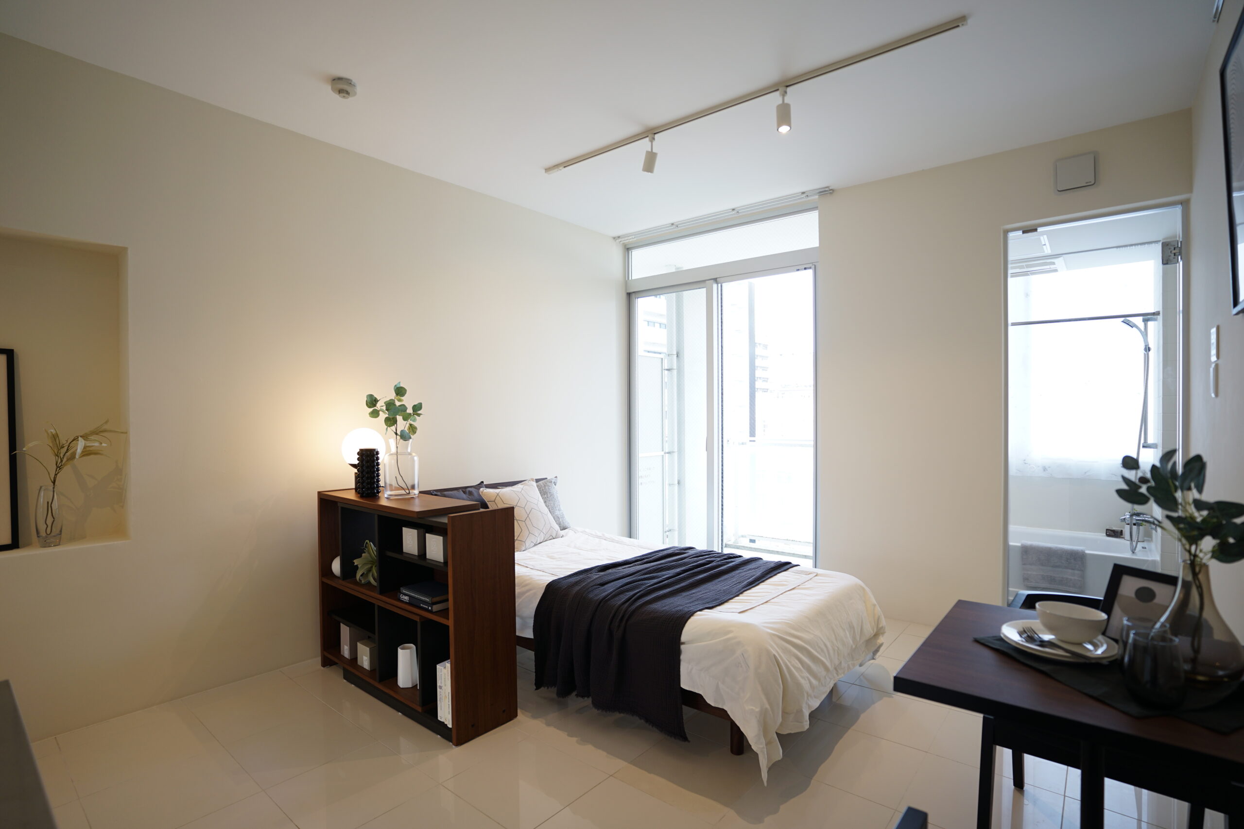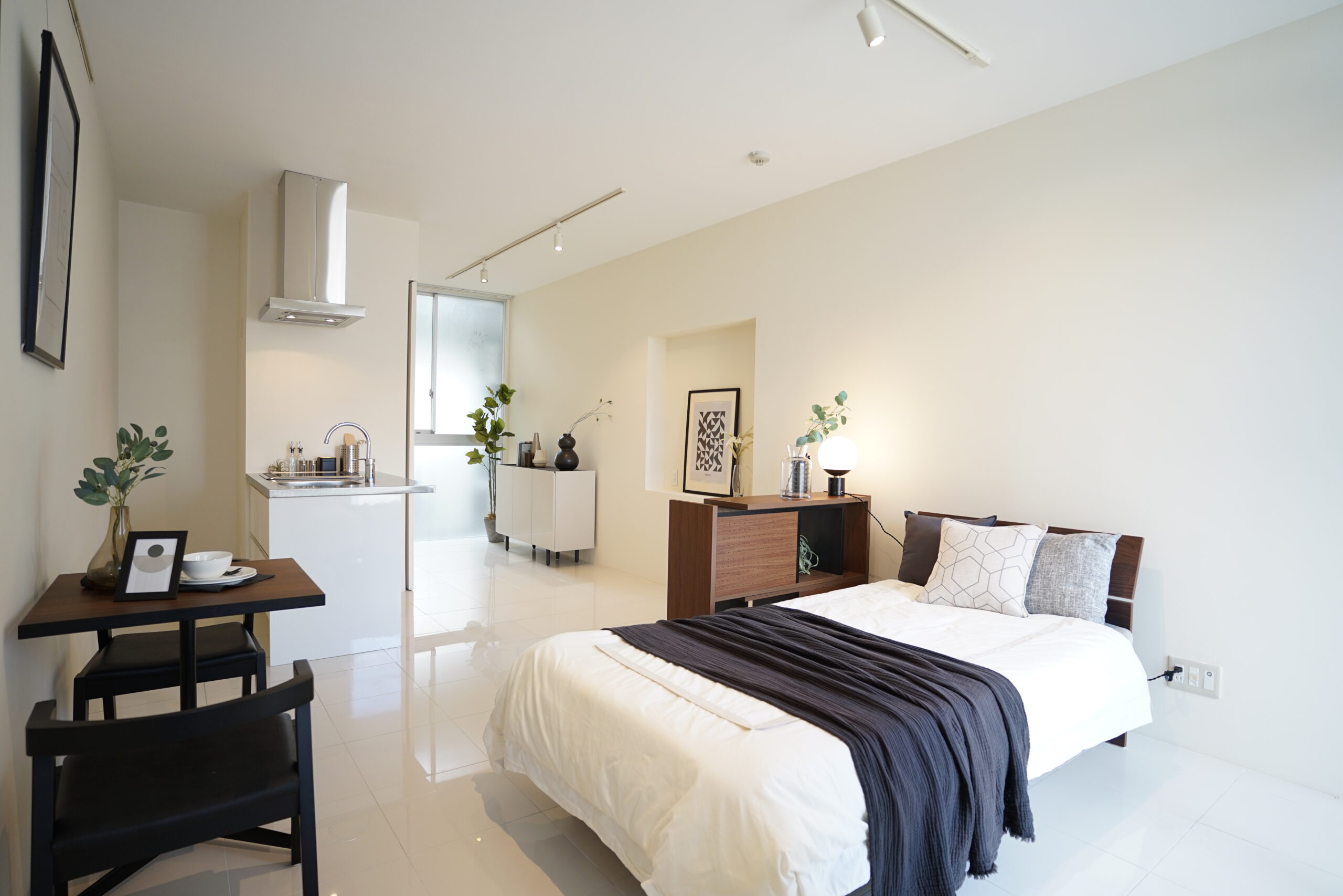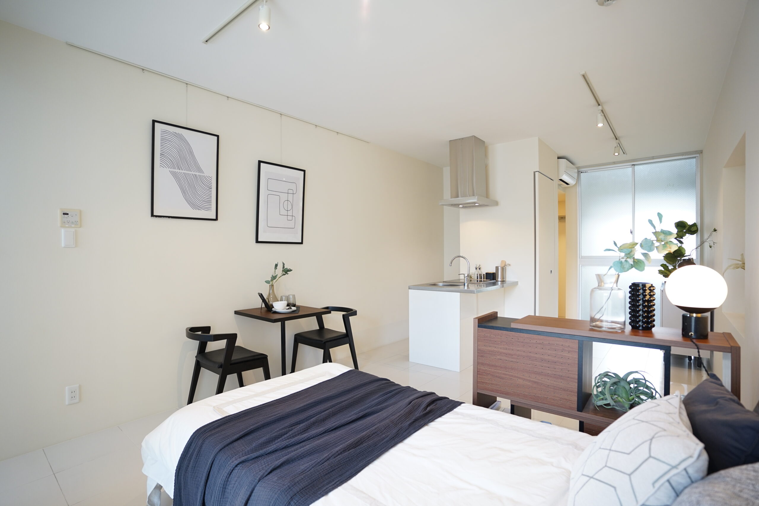デザイナーズ物件ならではのミニマルな内装を活かし、白を基調としたシンプルさを損なわない家具選定とすることで、すっきりとした開放感と上質感を兼ね備えたワンルームに仕上げました。