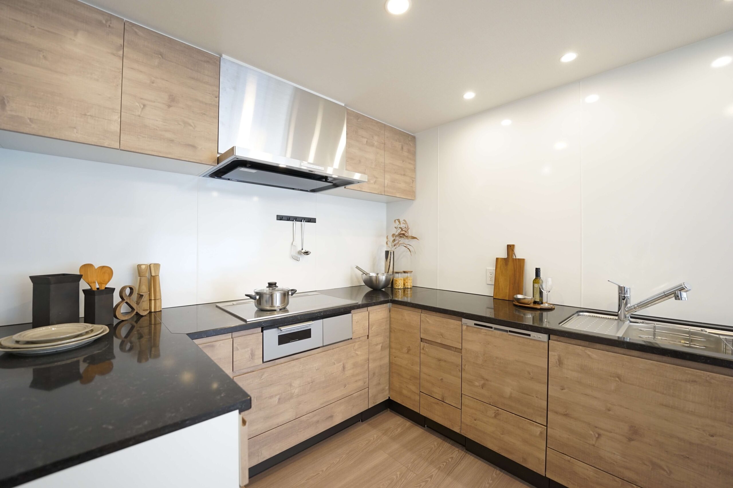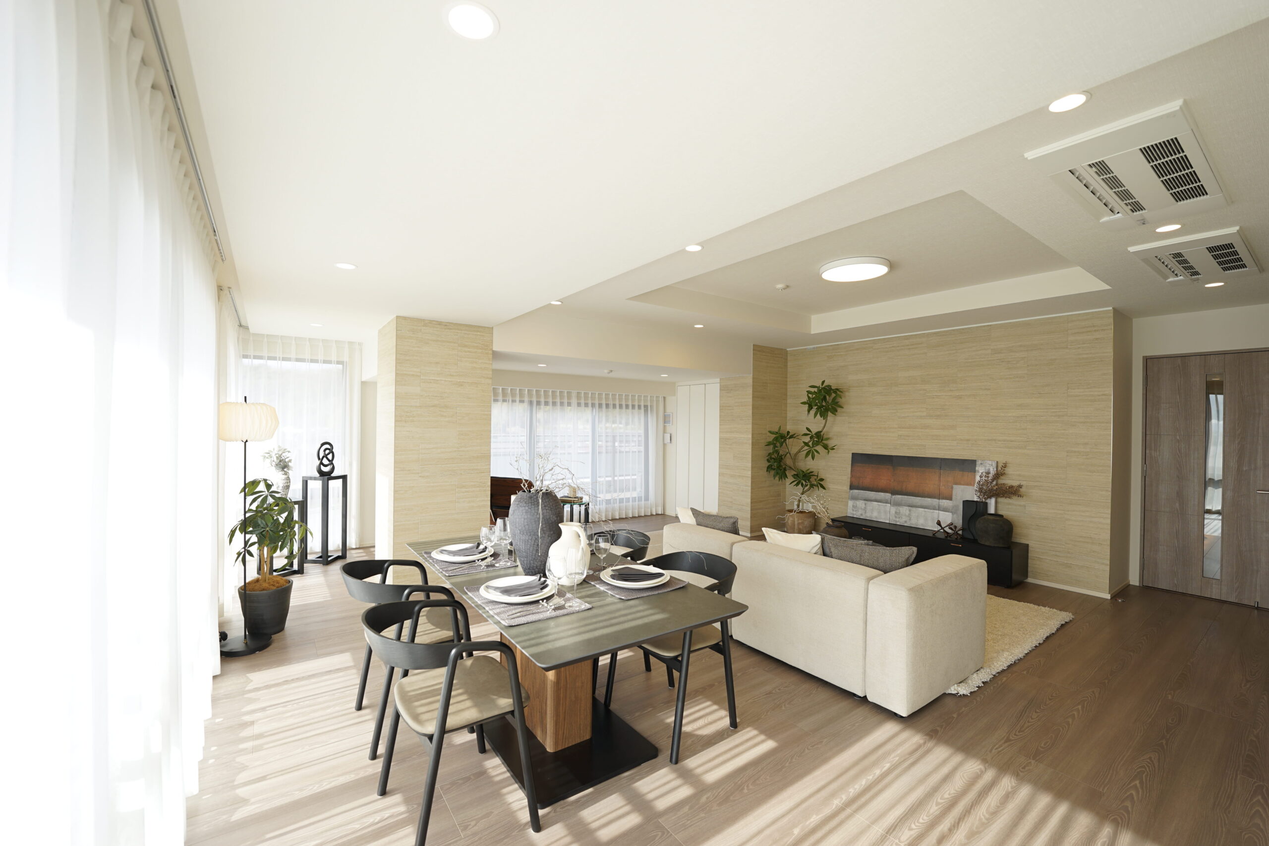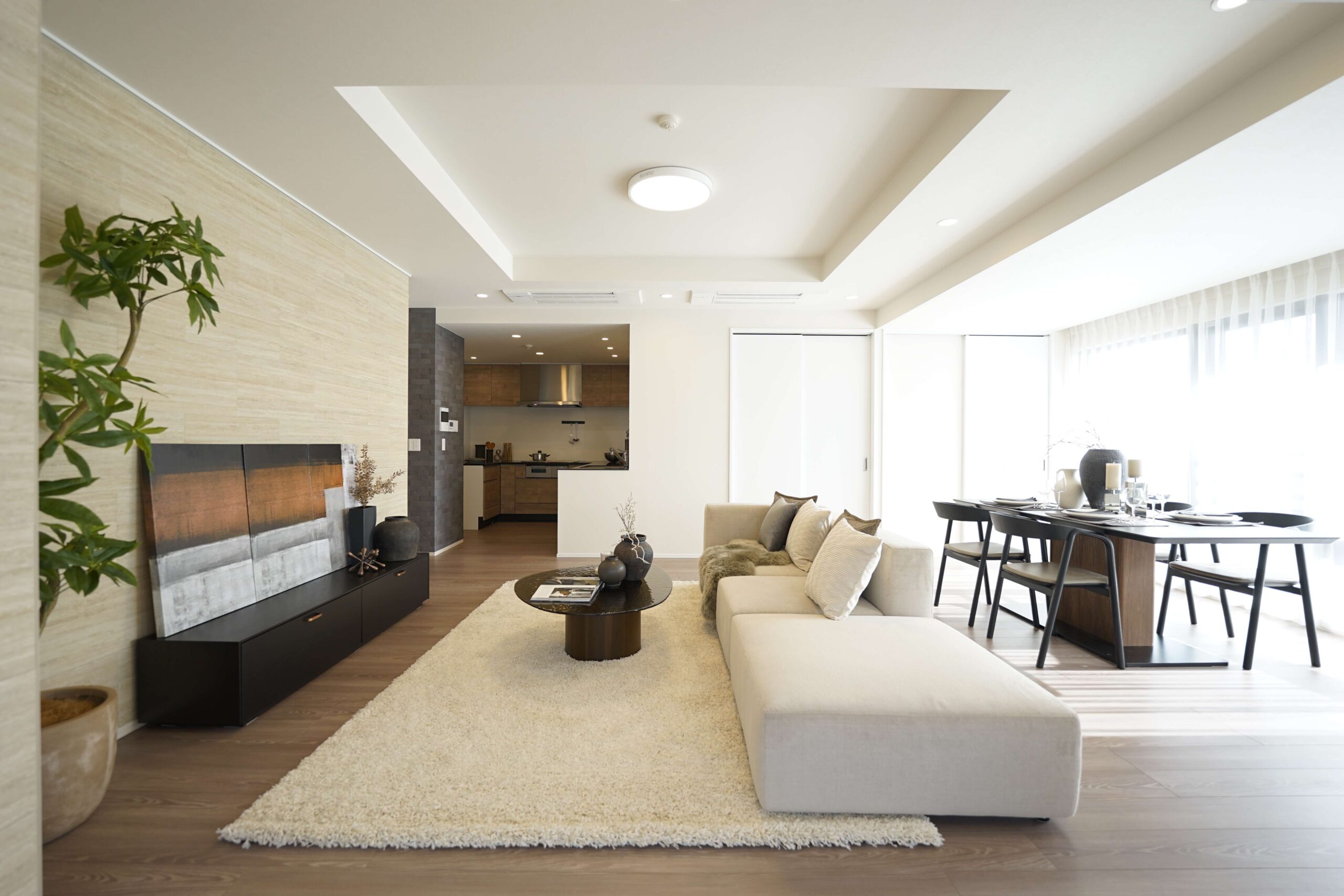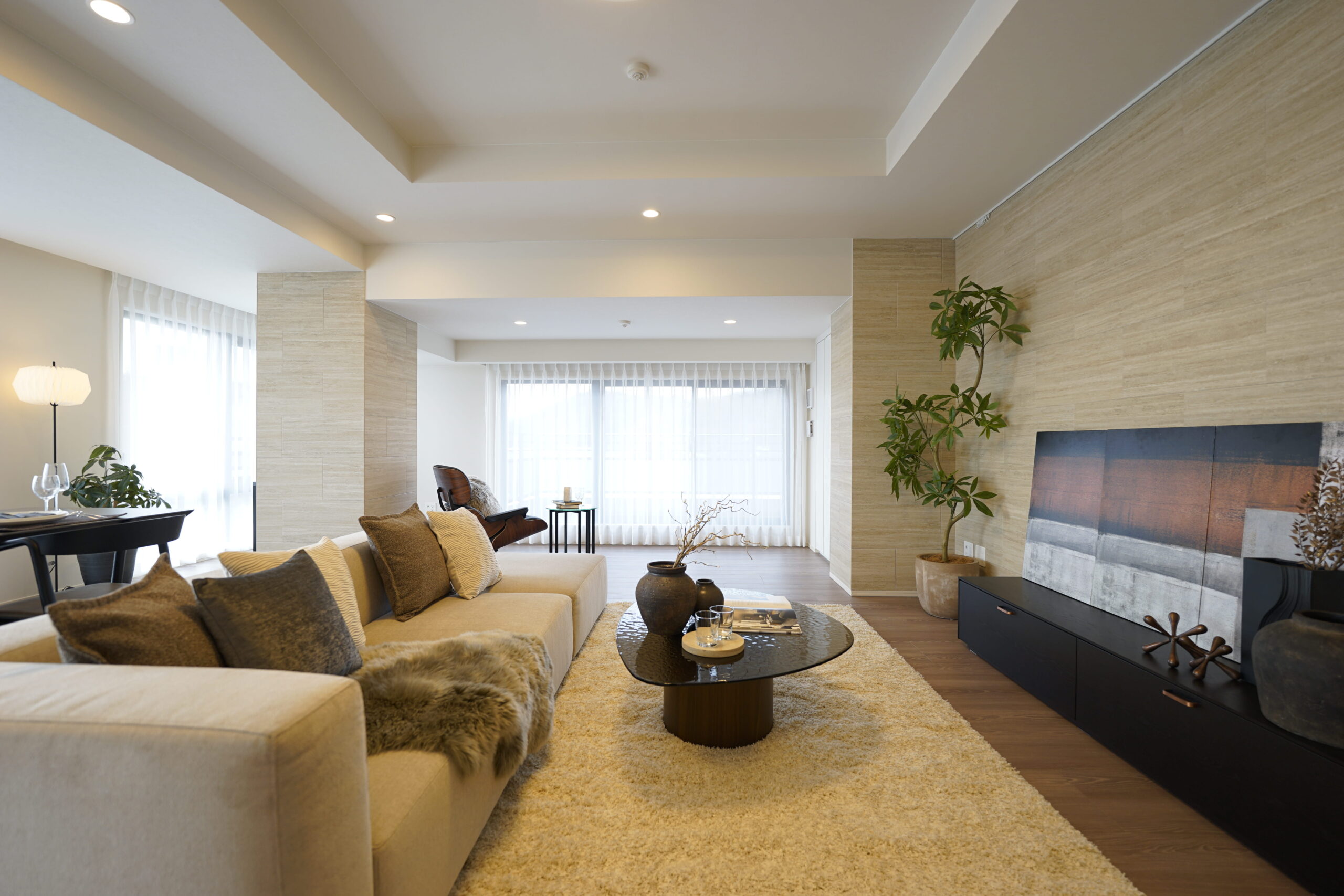内装に調和するウォルナットの家具をベースに、上質で重厚感のある空間を構成。キッチンタイルの色調に合わせたブラックのアクセントが全体を引き締め、メインのカウチソファにホワイトを配することで、重たさを感じさせない軽やかで洗練された高級感を演出しました。