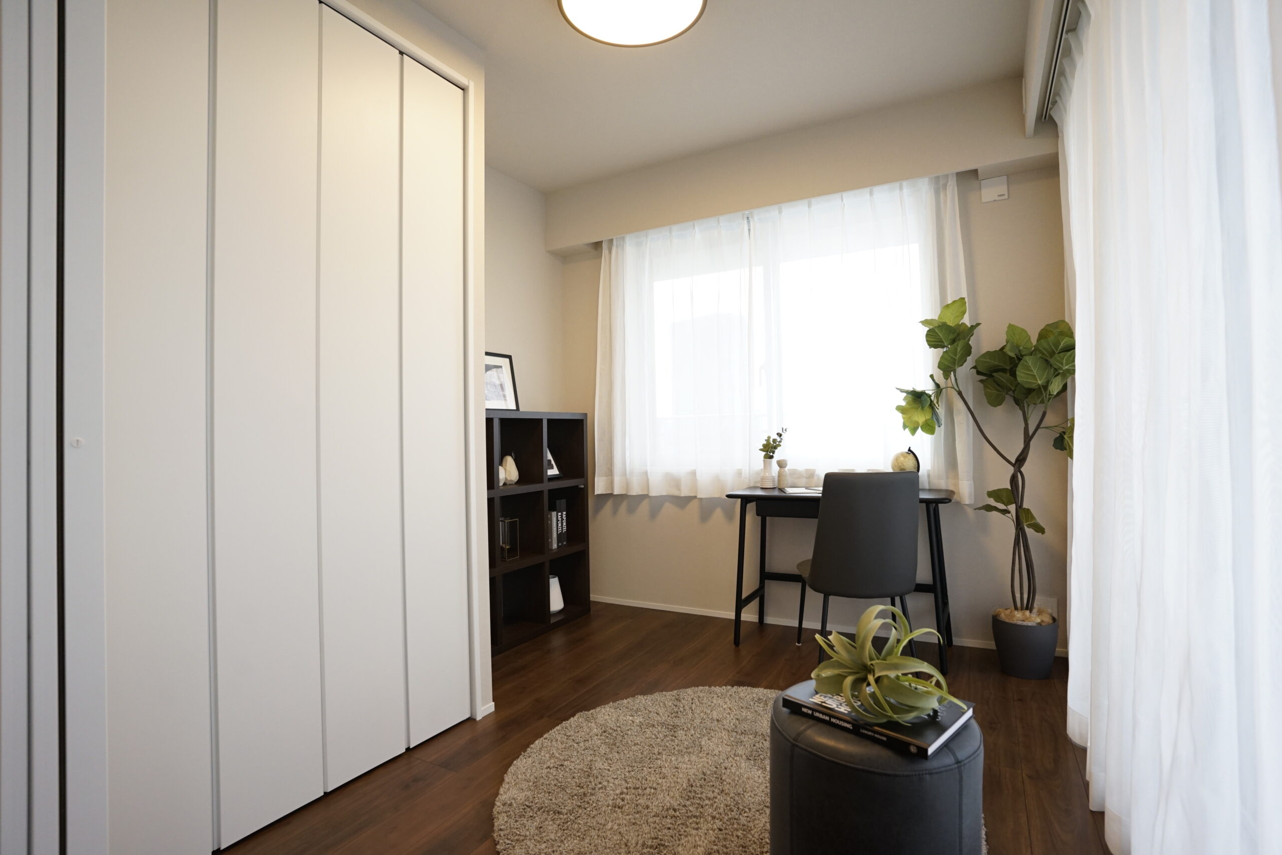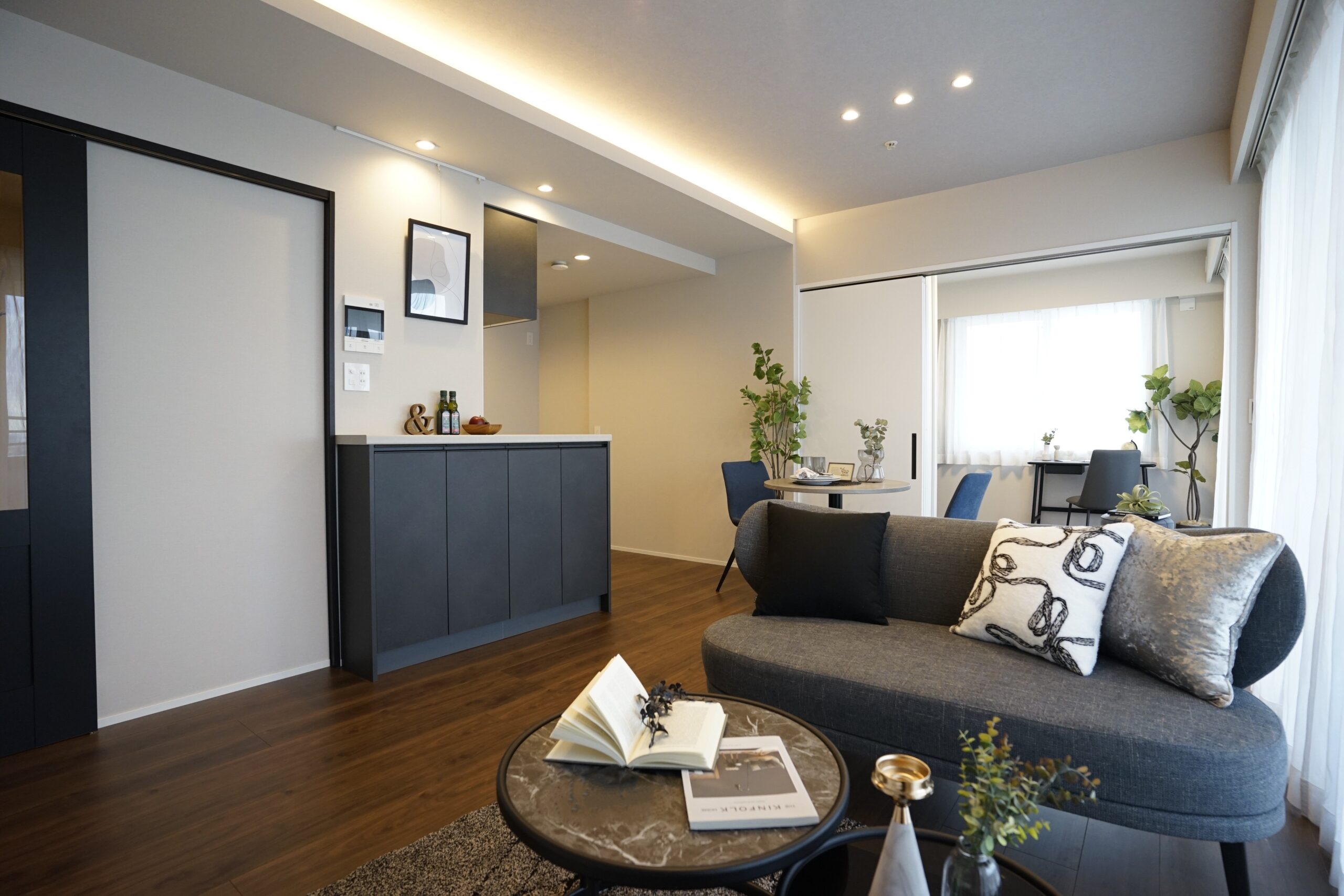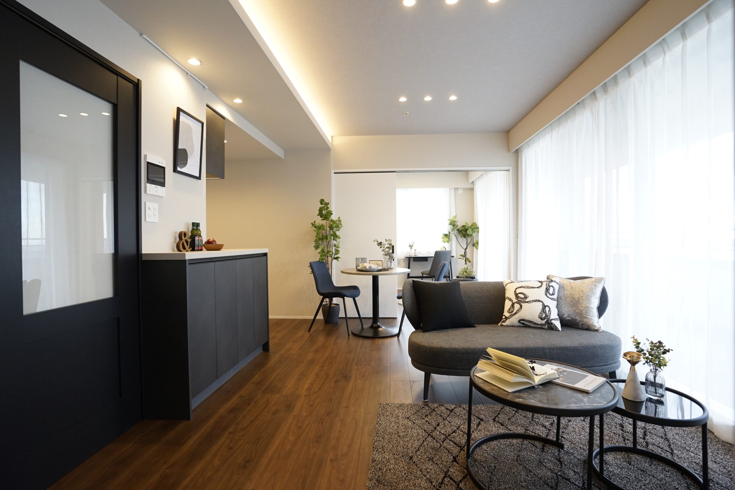 都心の眺望を楽しめるタワーマンションの一室。DINKS層を想定し、セラミック素材などの質感を活かしながら、モノトーンで統一したコーディネートに仕上げました。洗練されたスタイリッシュな空間が、都会的なライフスタイルを引き立てます。