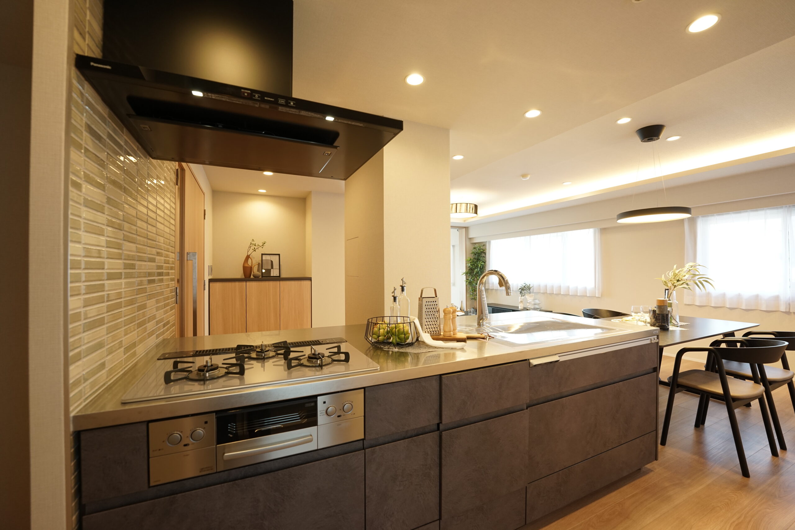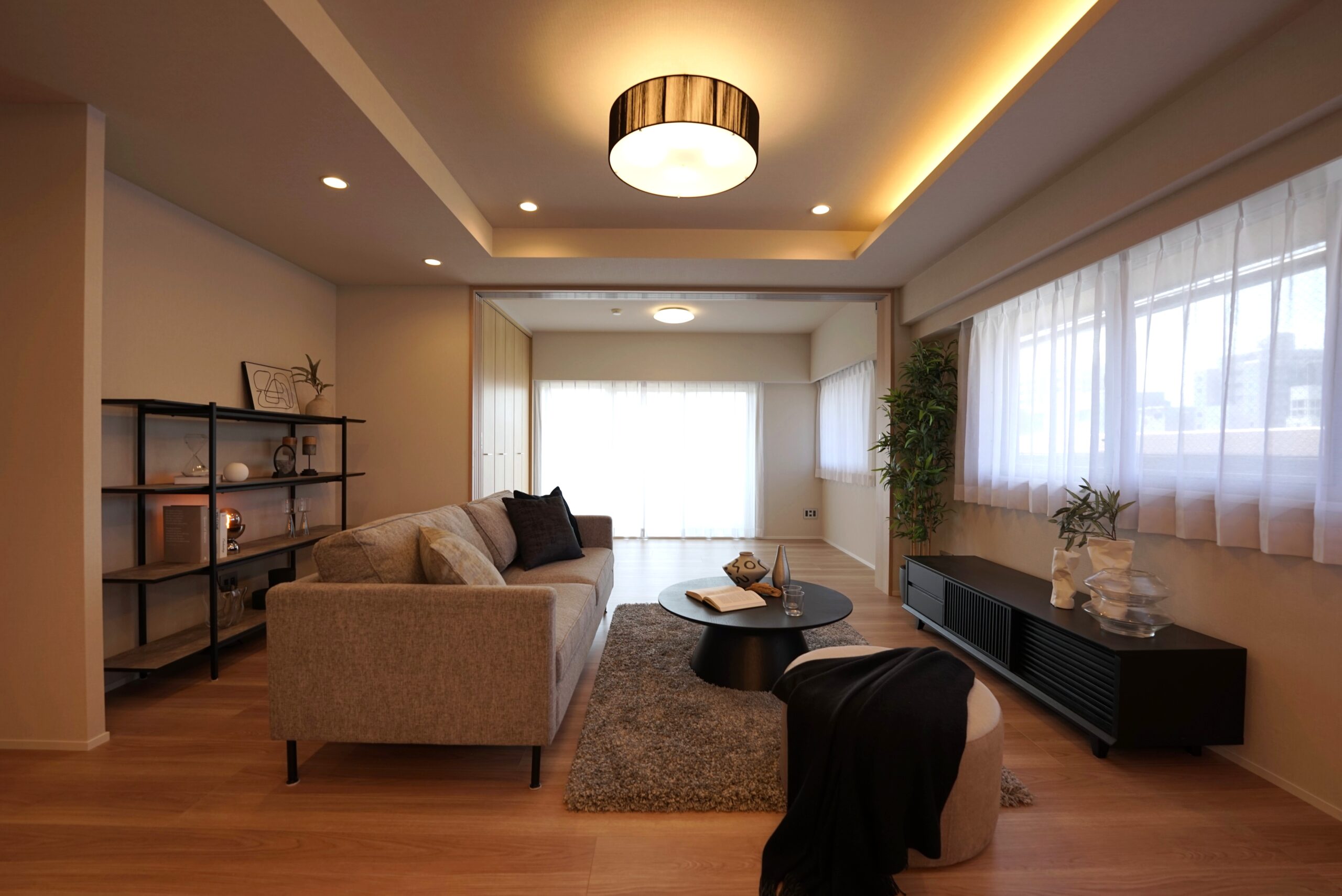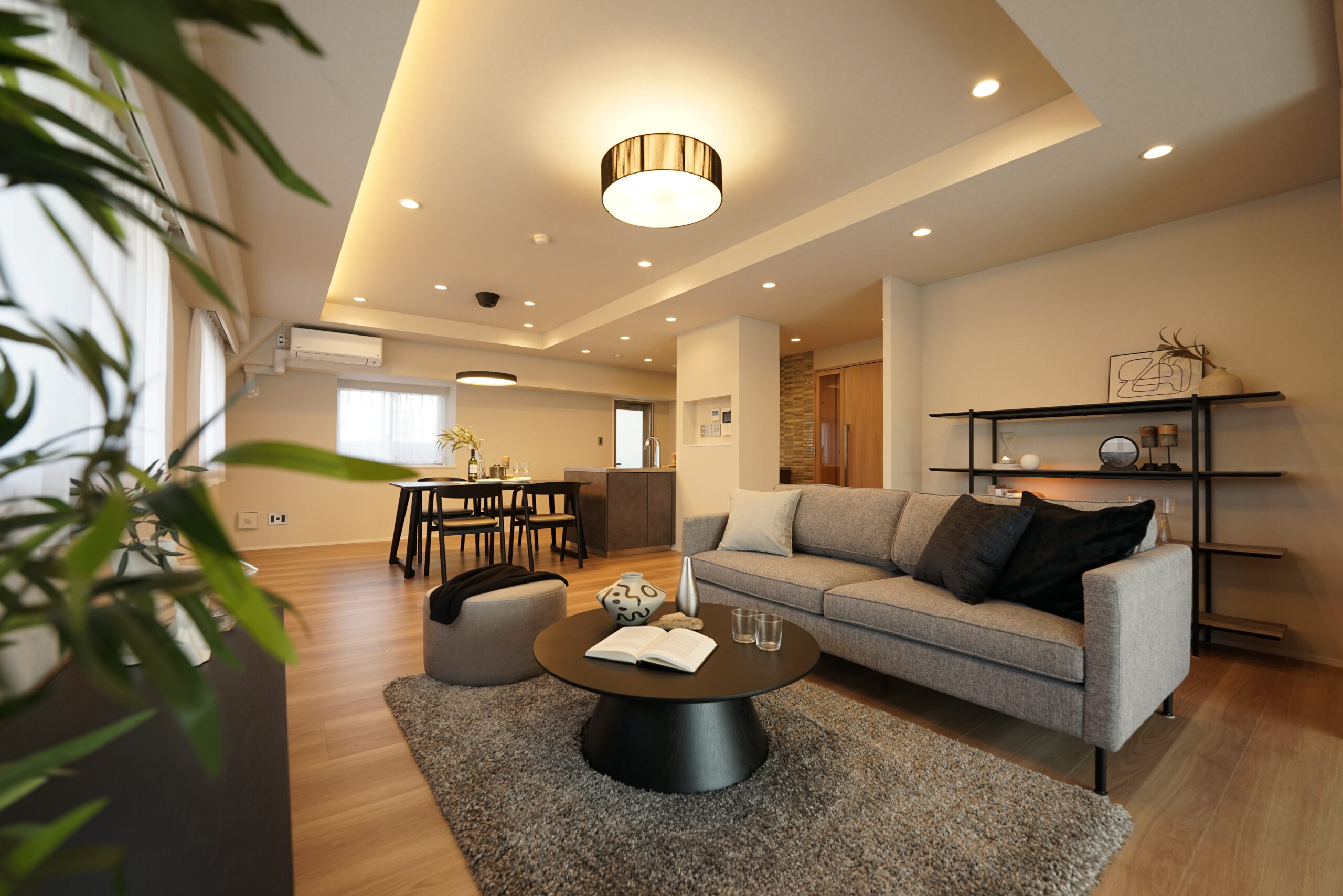 ブラックを基調とした家具で、モダンで高級感のあるコーディネートに。小物はニュートラルカラーで統一し、洗練された印象を演出しています。24帖を超える広々としたLDKを活かすため、ソファの後ろには高さのあるシェルフを配置。空間にメリハリと立体感を加え、広さと上質さを両立させた設えに仕上げています。