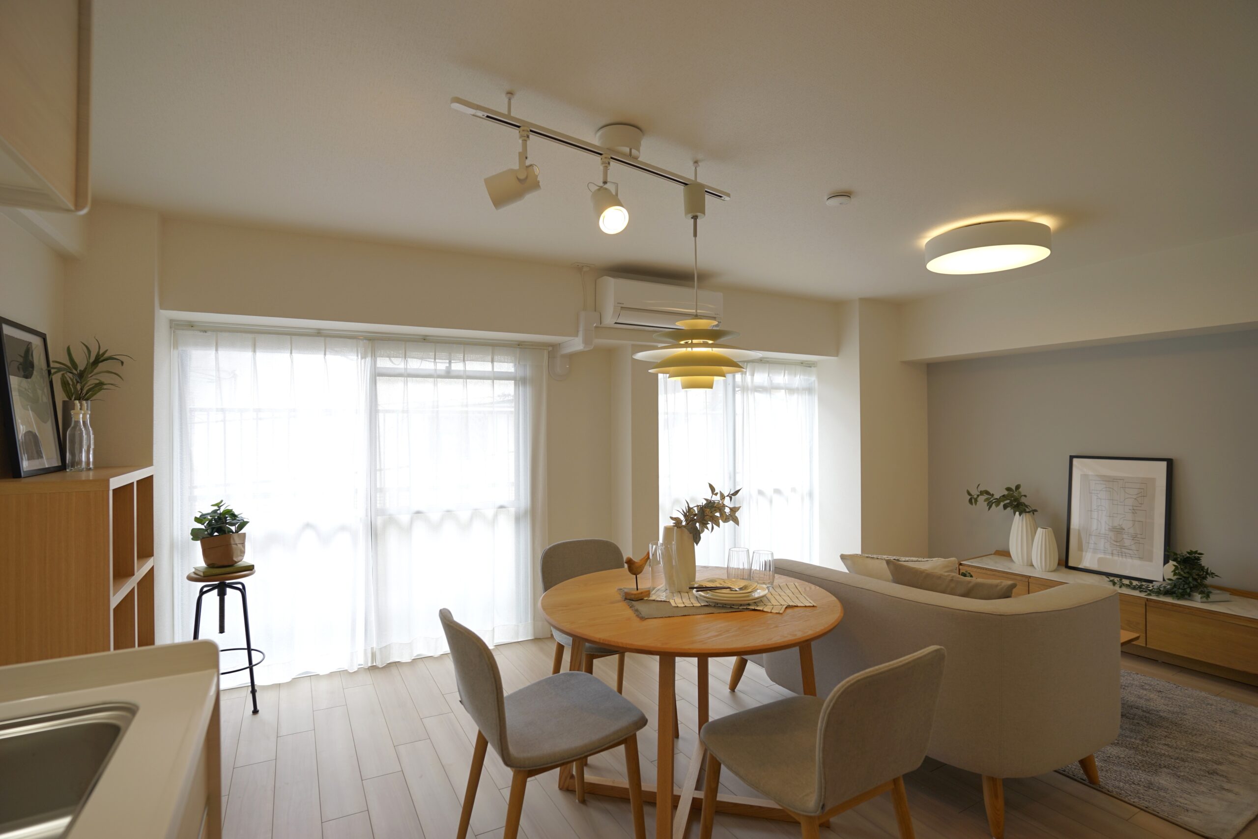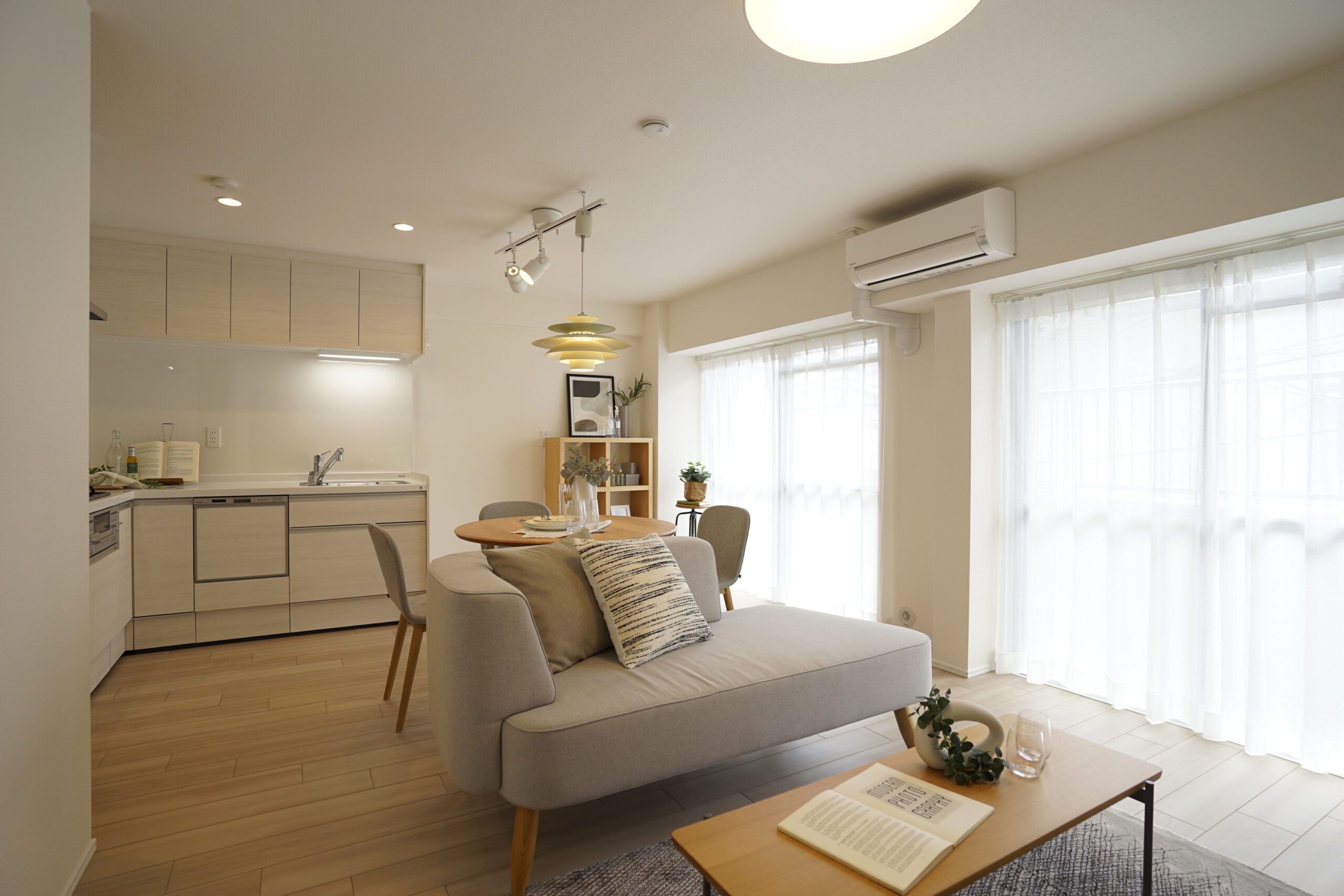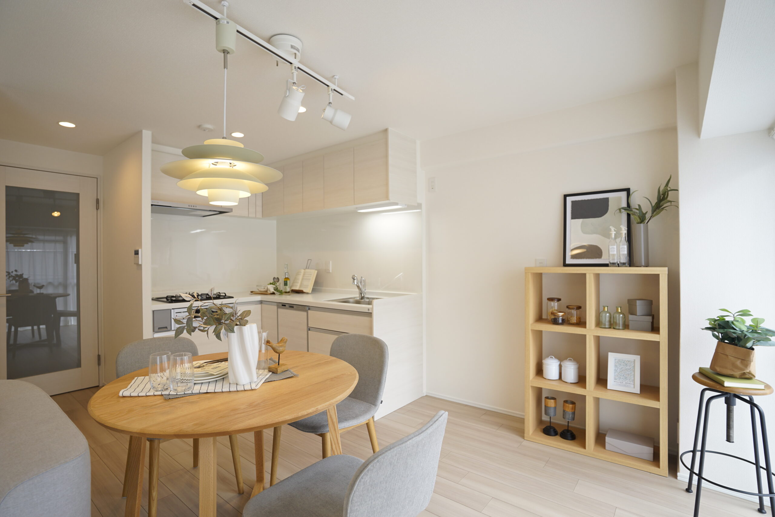 内装の雰囲気に調和するよう、オーク系の家具をベースに選定しました。木目の温かみが引き立ち、空間全体に柔らかなナチュラル感をプラスしています。