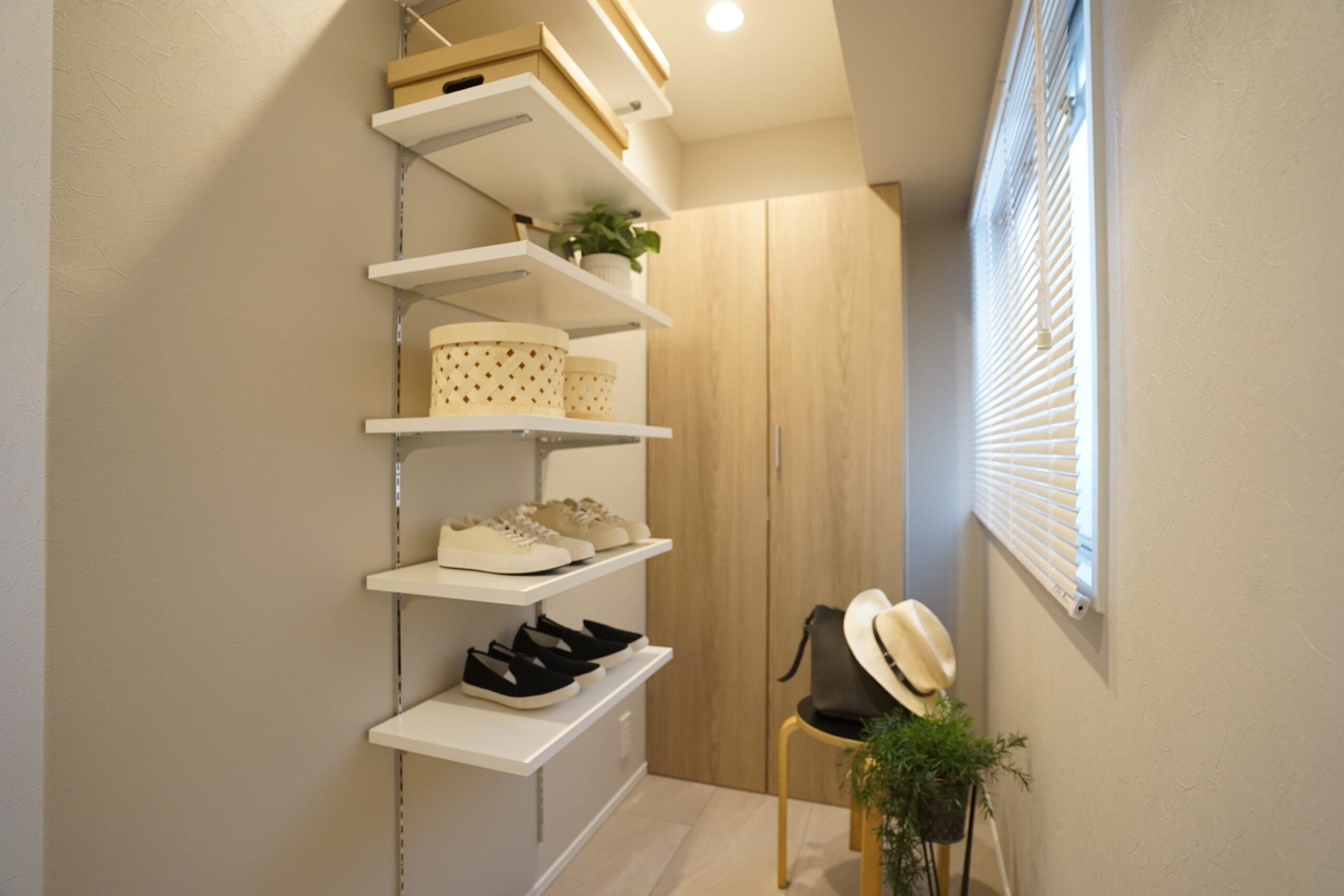 小物にはニュートラルカラーを中心に用いることで、シンプルながらも洗練された印象に。自然光との相性も良く、明るく開放的なリビング空間を演出しました。