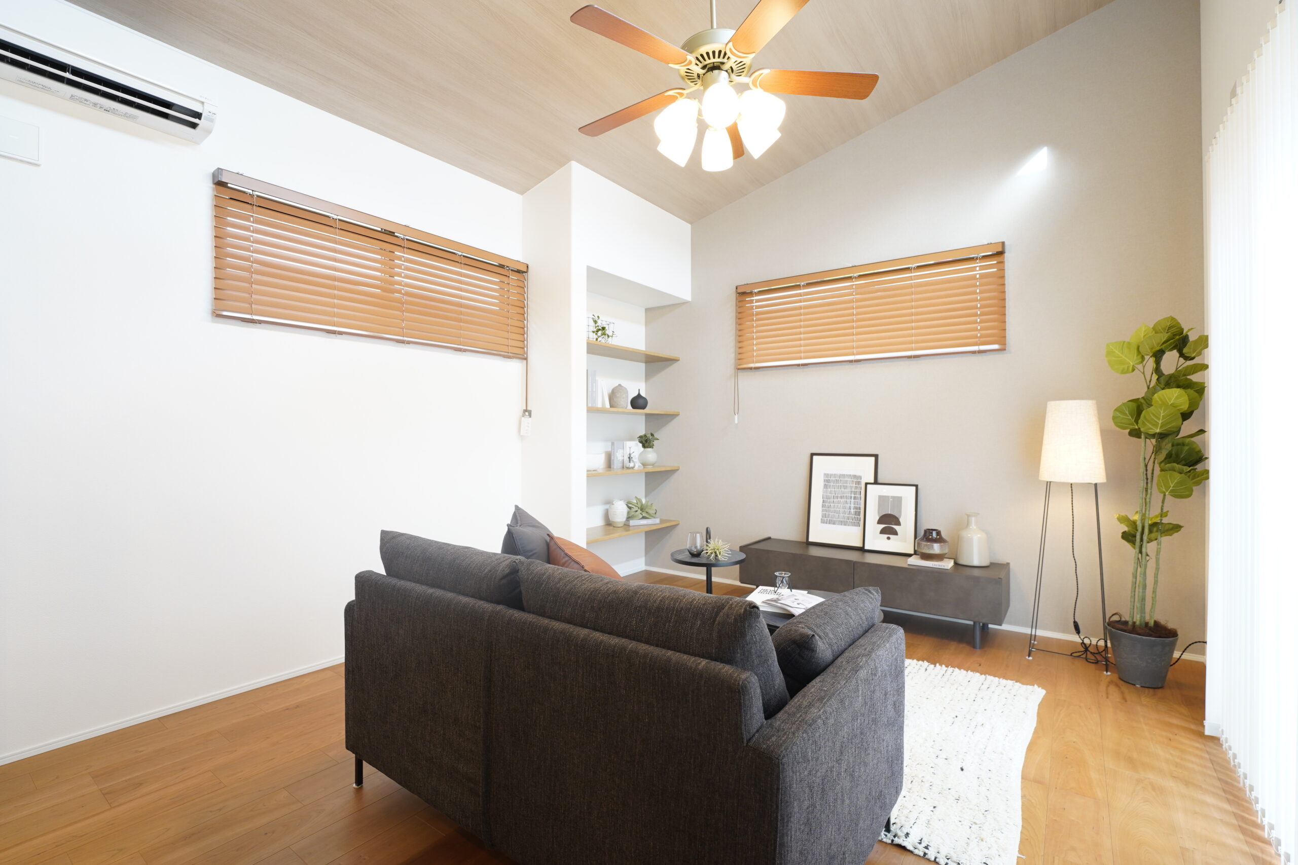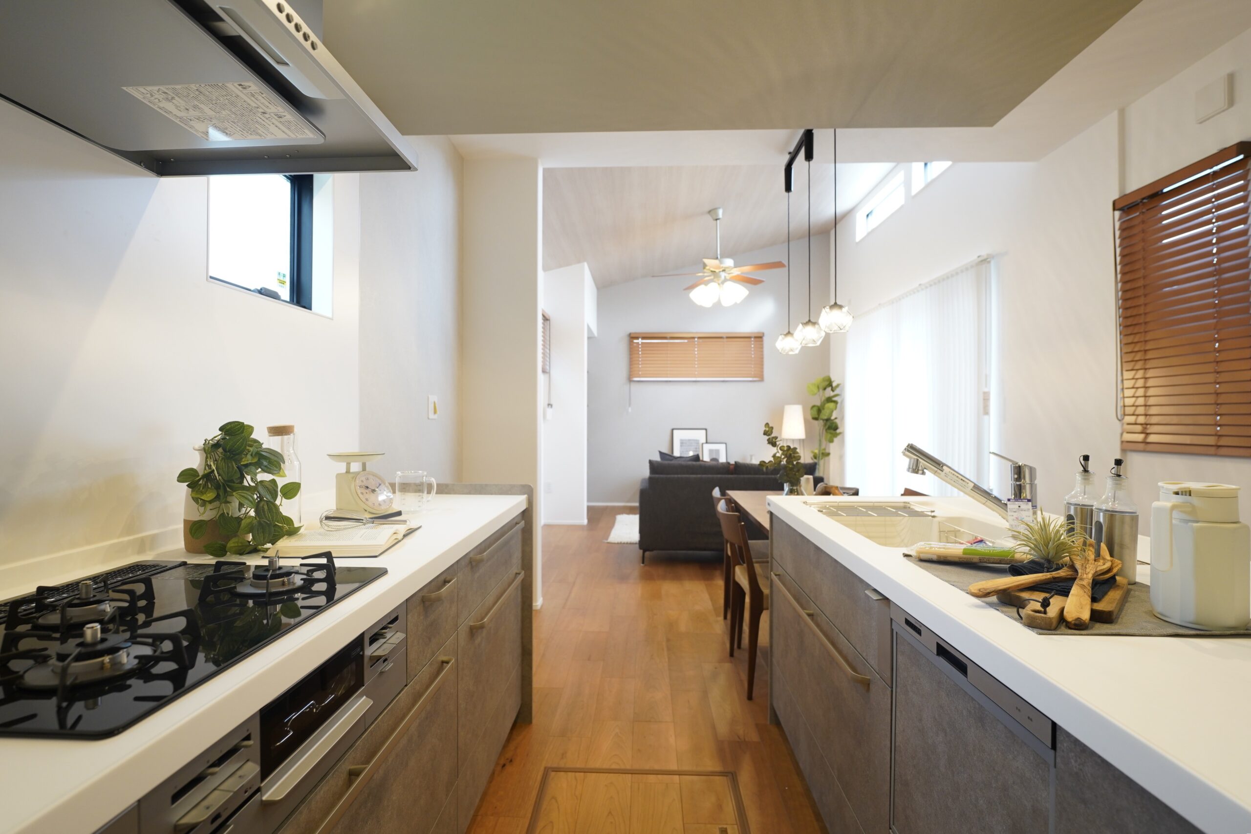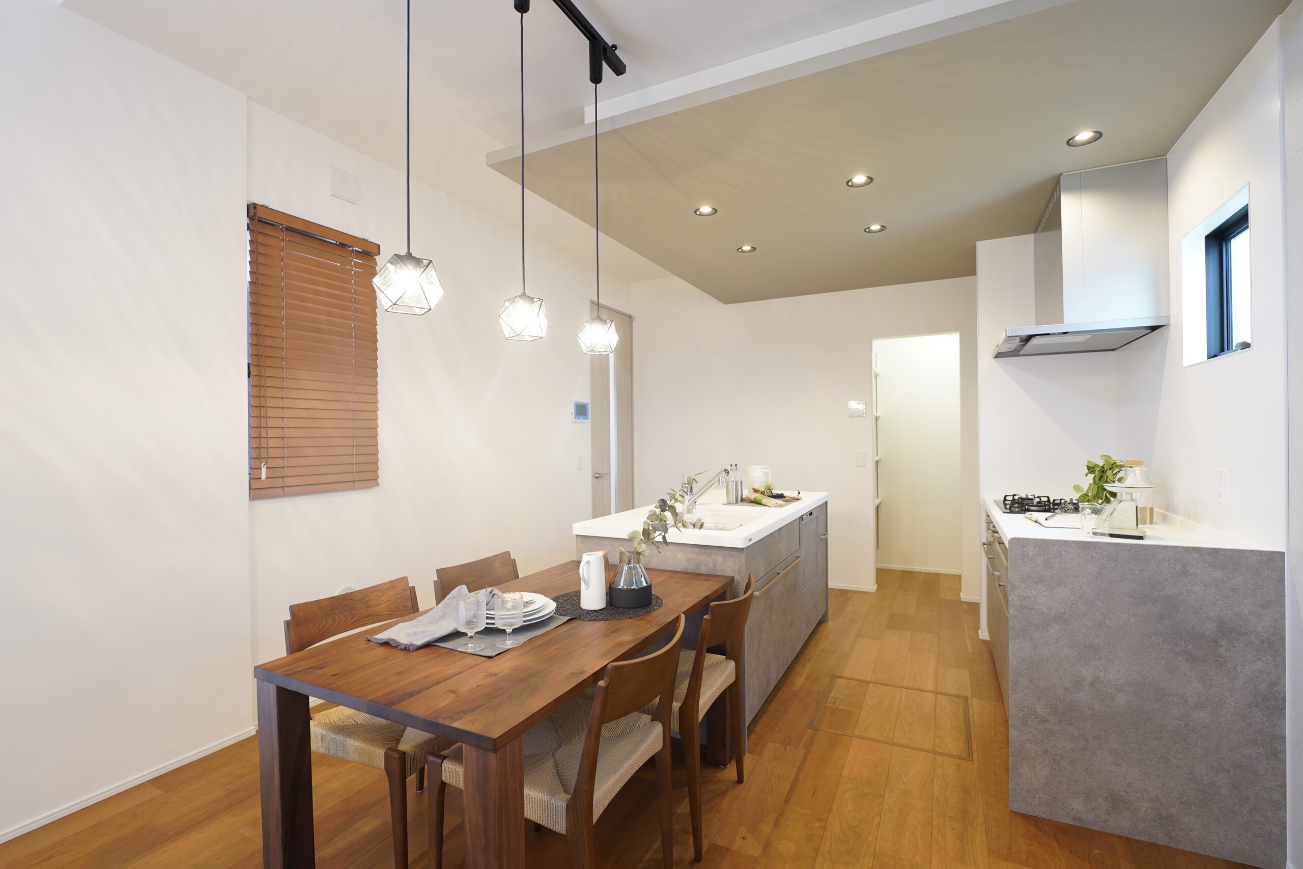 グレイッシュなアクセントクロスと、ブラックチェリーの深みある床色に合わせて、ウォールナットを基調にコーディネートしました。ポイントでブラックを取り入れることで、空間にメリハリをつけ、上品で落ち着いた印象に仕上げています。