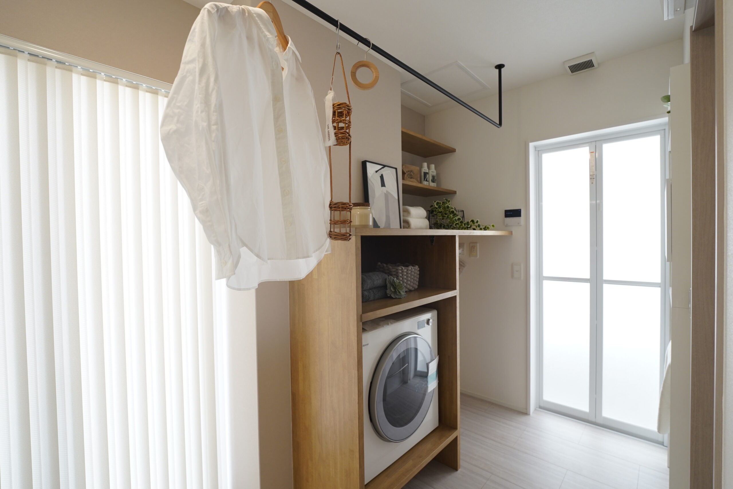こだわりのランドリースペースには、使用イメージが湧くよう小物を設え、生活のシーンを感じられる演出を加えました。