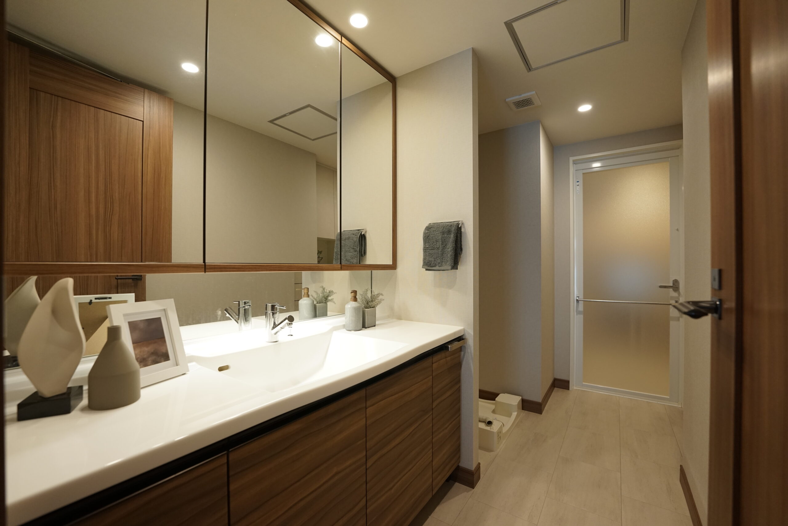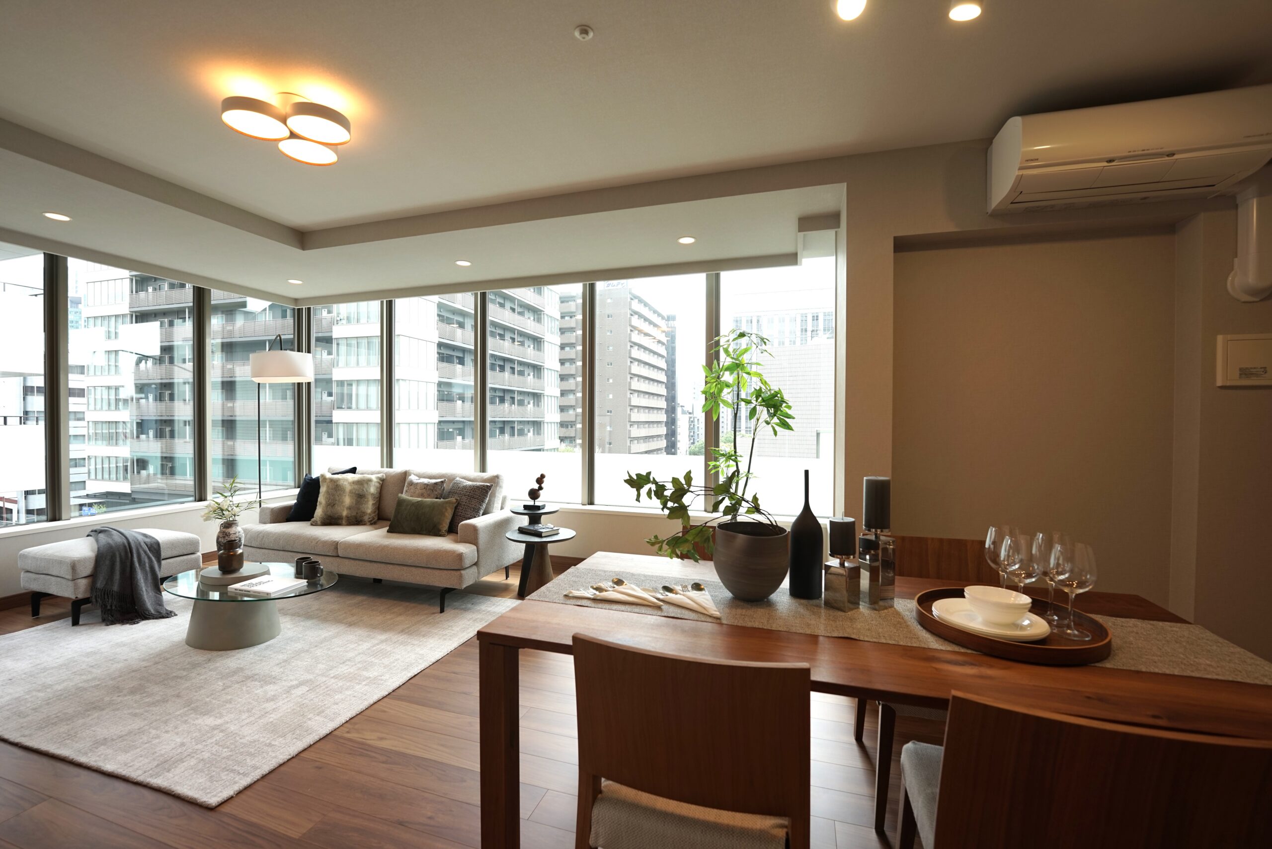 内装に合わせてウォルナット系家具を基調に選定。デザイン性の高いセンターテーブルをアクセントに取り入れ、洗練された印象のリビング空間に。グレー・ブラウン系を基調としたインテリア小物で統一感を持たせ、上品で落ち着いた雰囲気を演出しました。