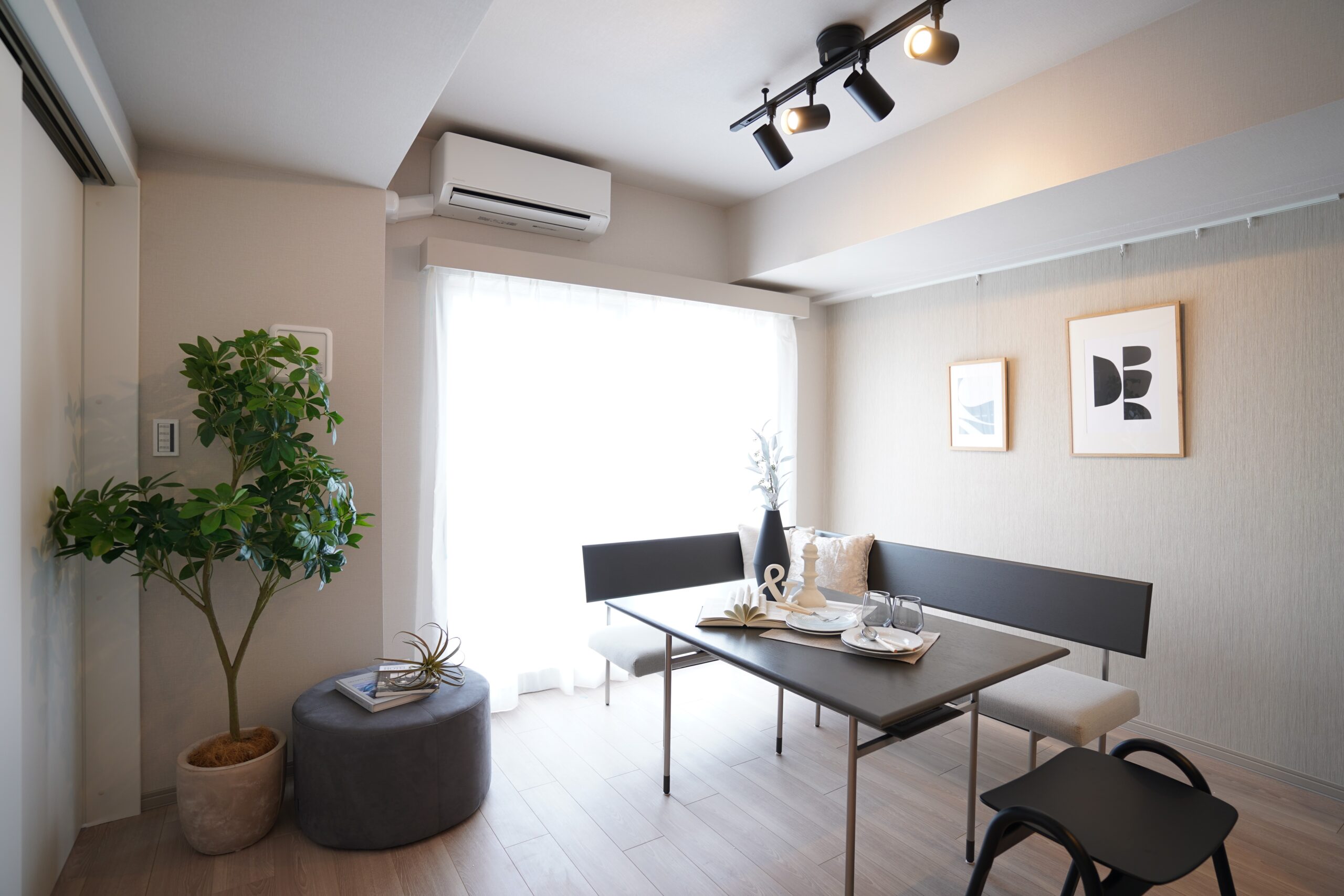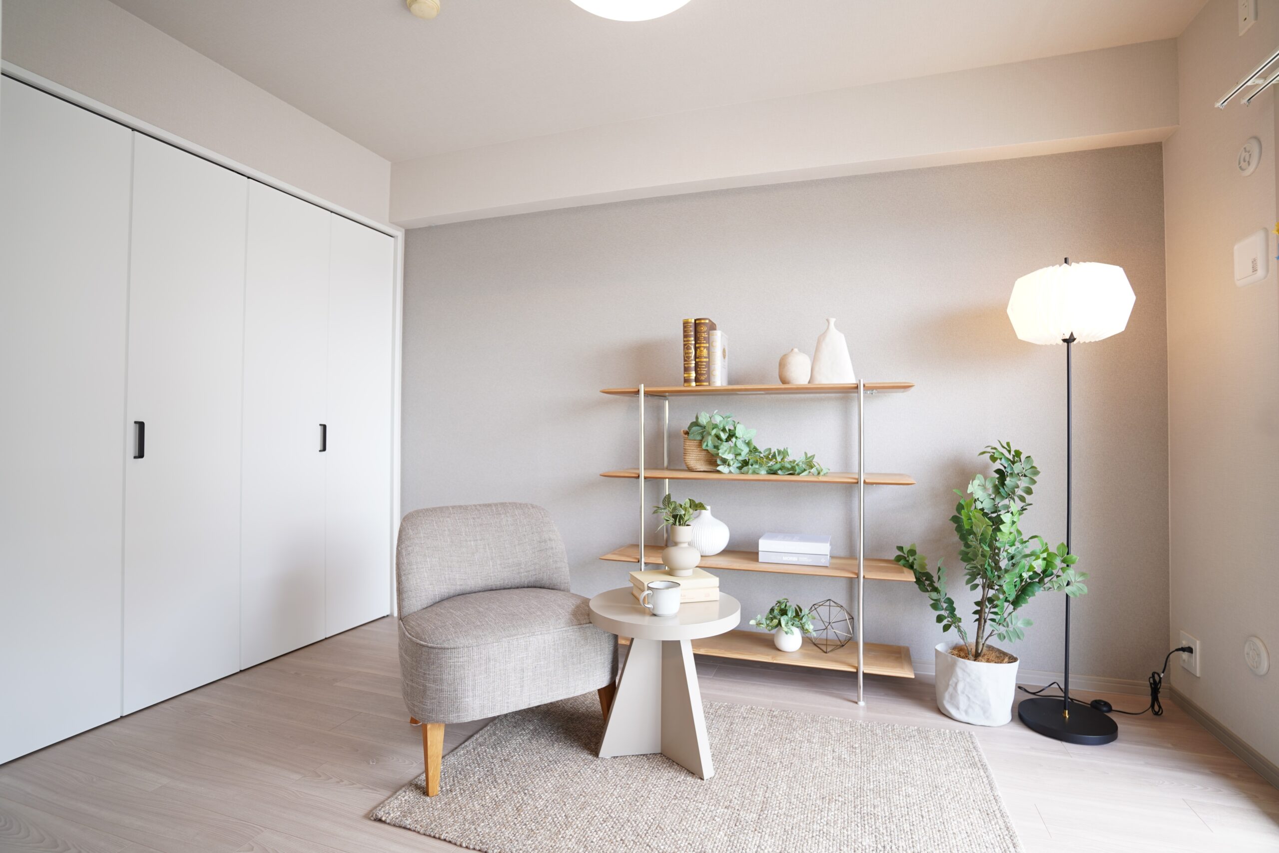 リビング横の洋室は、明るいグレージュ系でコーディネートし、都会的でありながらも温かみのあるセカンドリビングに仕上げました。