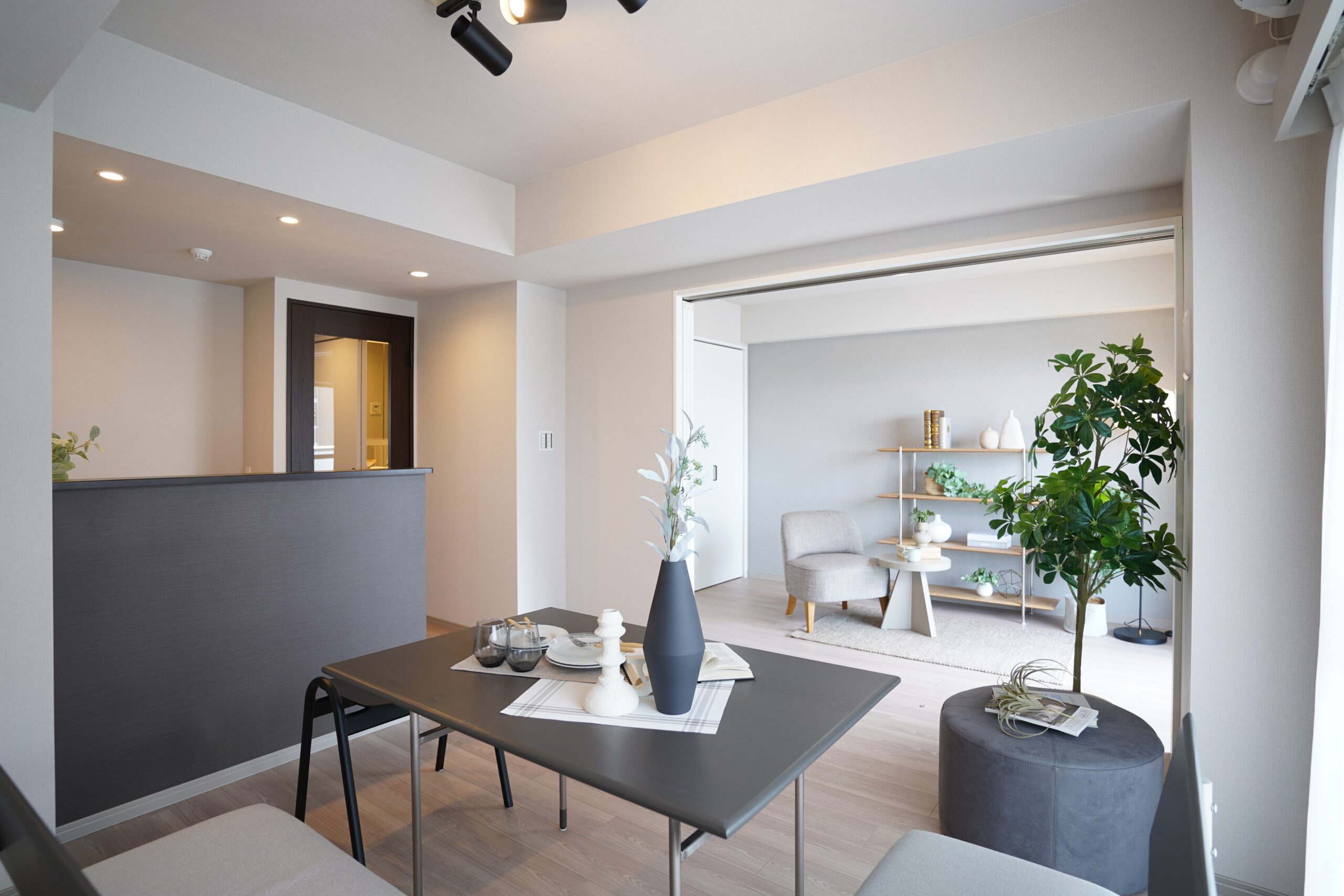 ダークトーンのキッチンカウンターやリビング扉に合わせ、グレイッシュカラーの家具を中心にモダンな雰囲気を演出しています。